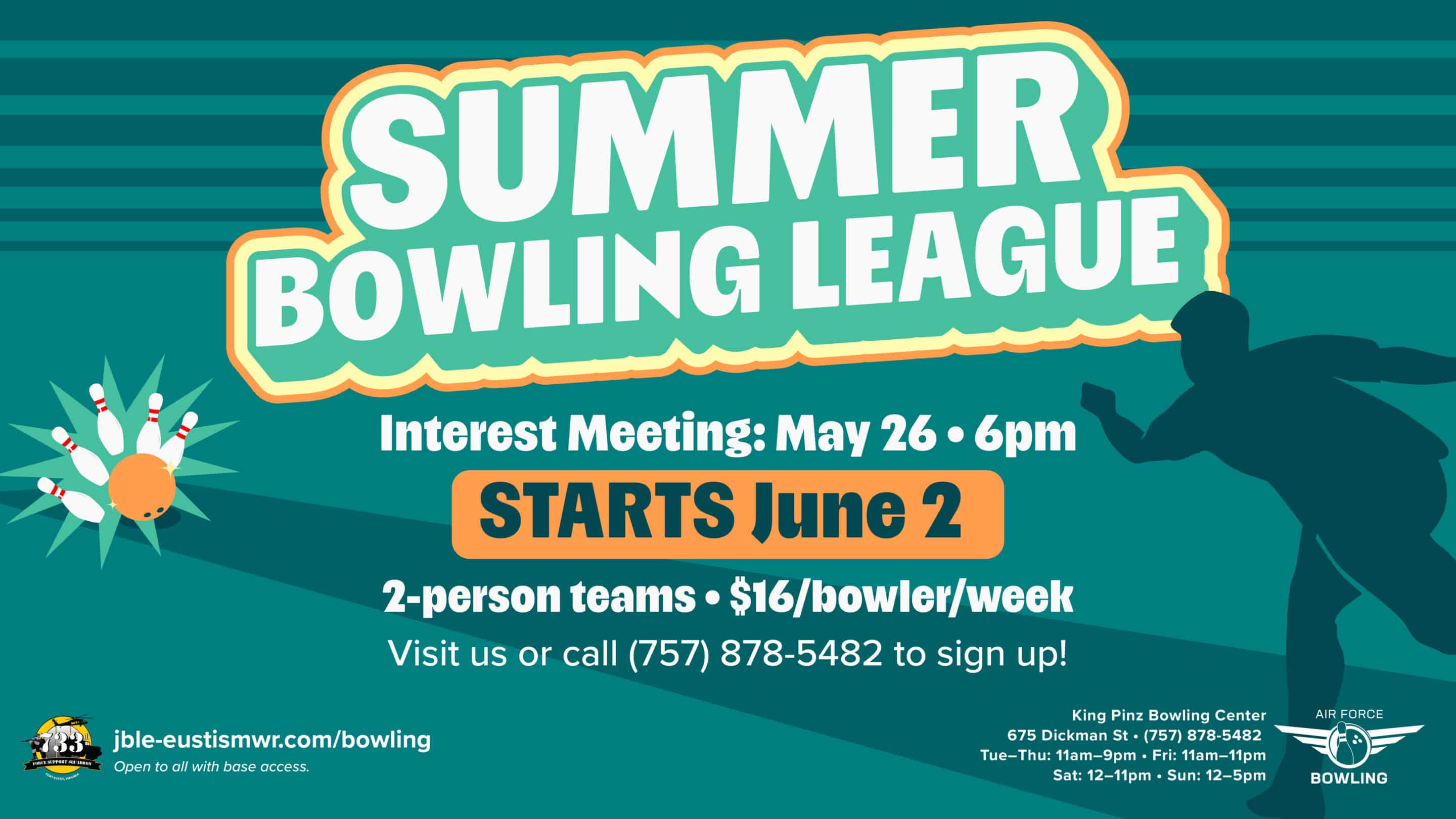 Our Summer Bowling League is ready to get some new players! Come on down to our first interest meeting starting May 26. Give our office a call for more details. Bring your friends, build your team, and get your game one this summer.