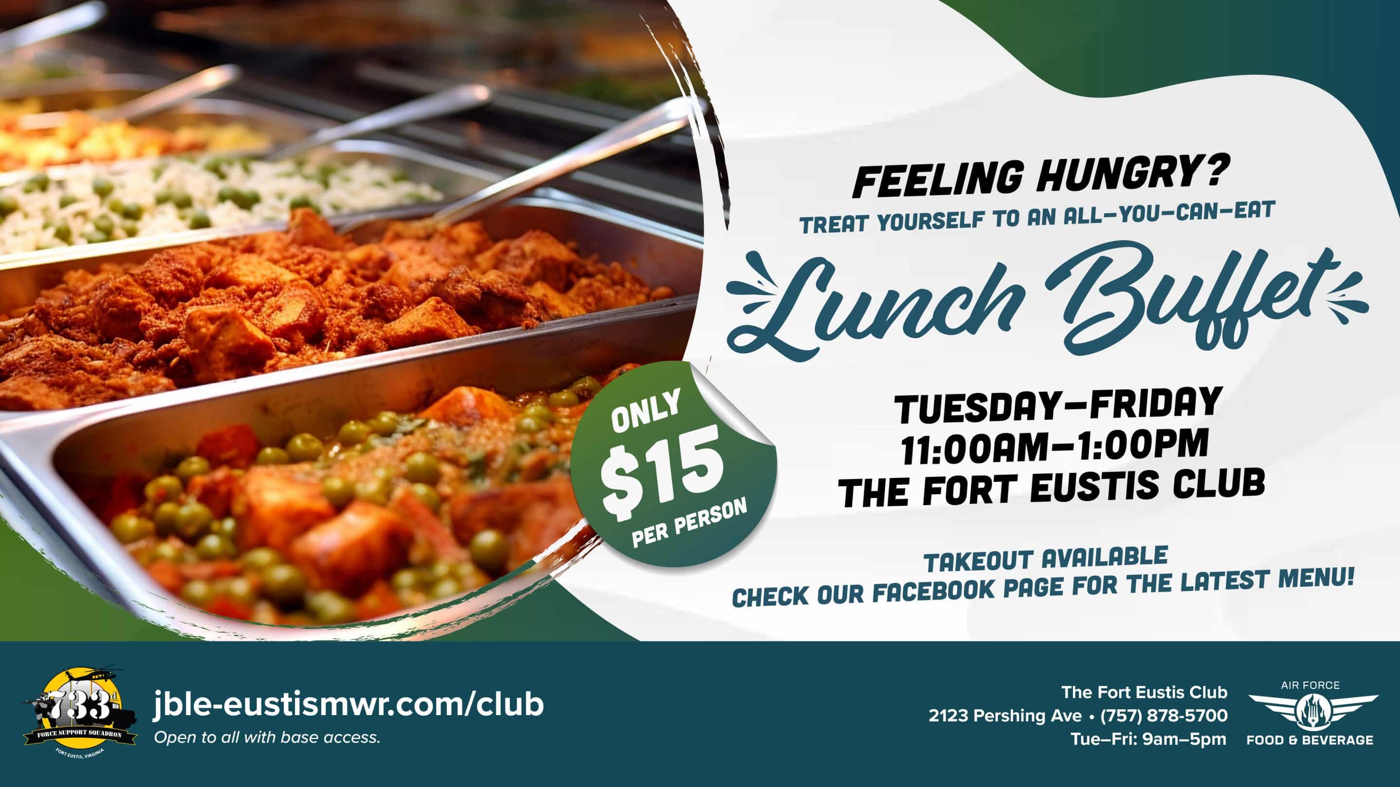 Take a well-deserved lunch break at the Fort Eustis Club’s All You Can Eat Lunch Buffet. With great value, friendly service, and plenty of options, it’s the perfect midday meal for Soldiers, civilians, and guests alike.